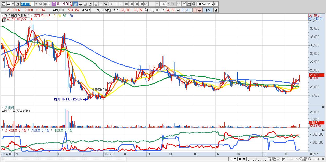 - 에스바이오메딕스 (23,500원 ▲ 8.8% , 시총: 2,787억, 거래량: 240,968, 거래대금:56억)