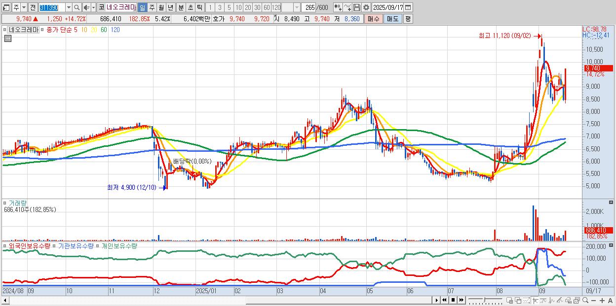 - 네오크레마 (9,740원 ▲ 14.72% , 시총: 1,232억, 거래량: 686,410, 거래대금:64억)