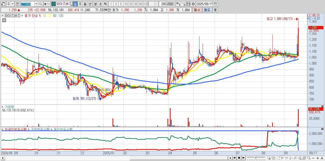 - 와이즈버즈 (1,299원 ▲ 22.09% , 시총: 655억, 거래량: 56,133,181, 거래대금:715억)