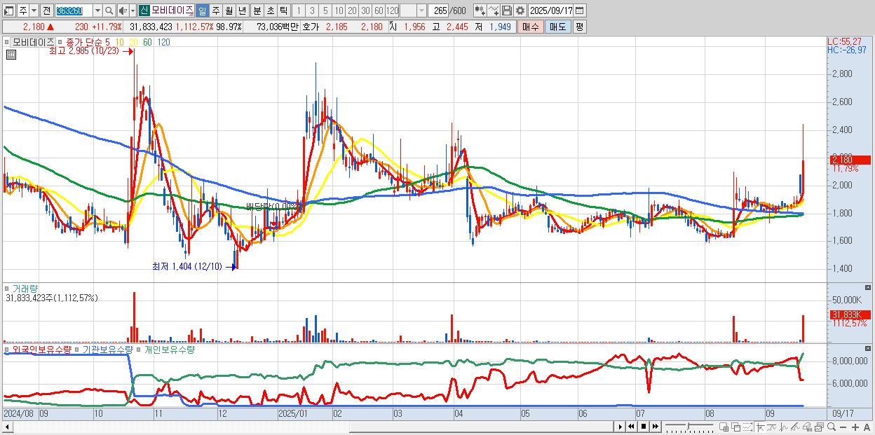 - 모비데이즈 (2,180원 ▲ 11.79% , 시총: 701억, 거래량: 31,833,423, 거래대금:730억)
