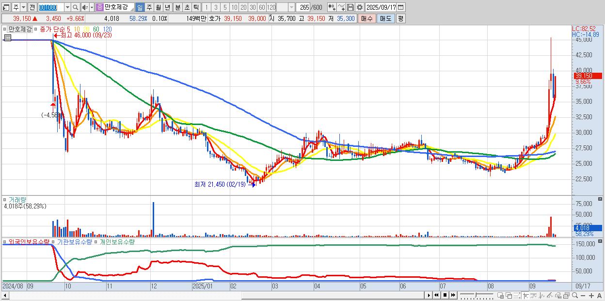 - 만호제강 (39,150원 ▲ 9.66% , 시총: 1,625억, 거래량: 4,018, 거래대금:1억)