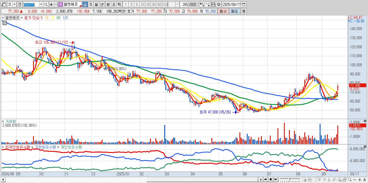 - 엘앤에프 (77,300원 ▲ 9.34% , 시총: 28,072억, 거래량: 1,408,191, 거래대금:1,075억)