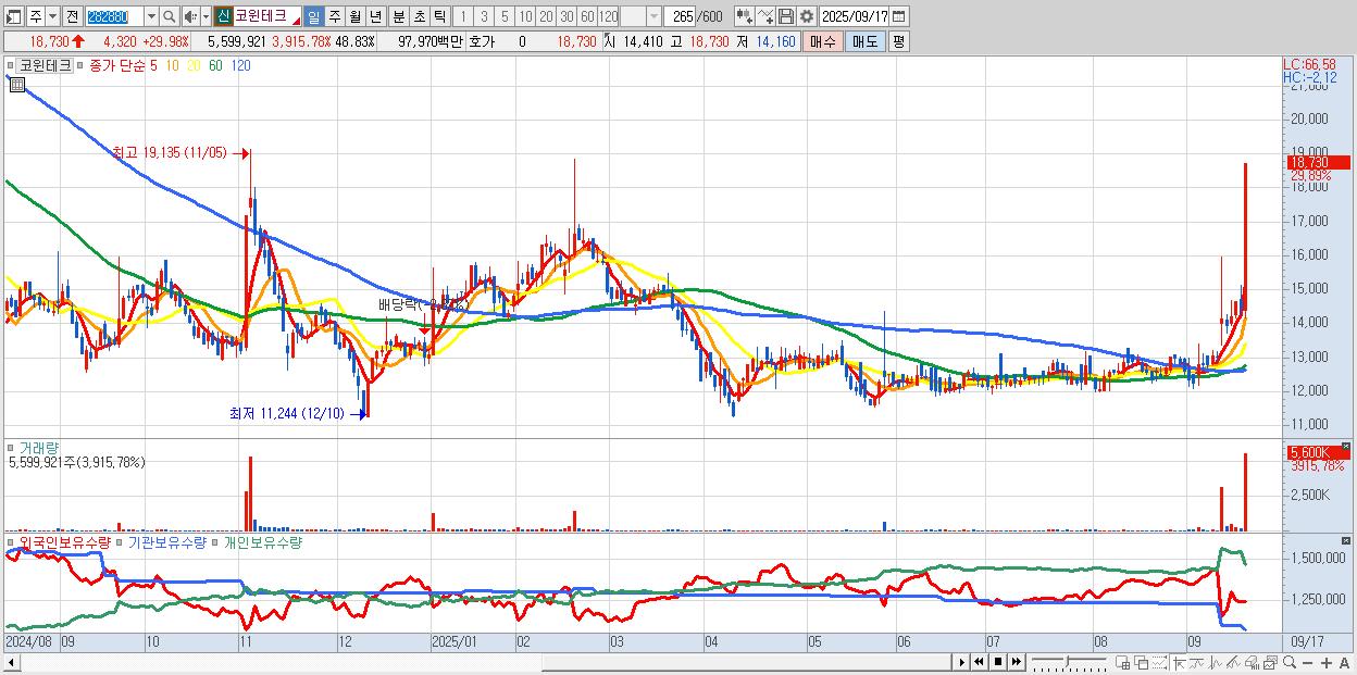 - 코윈테크 (18,730원 ▲ 29.98% , 시총: 2,148억, 거래량: 2,811,005, 거래대금:492억)