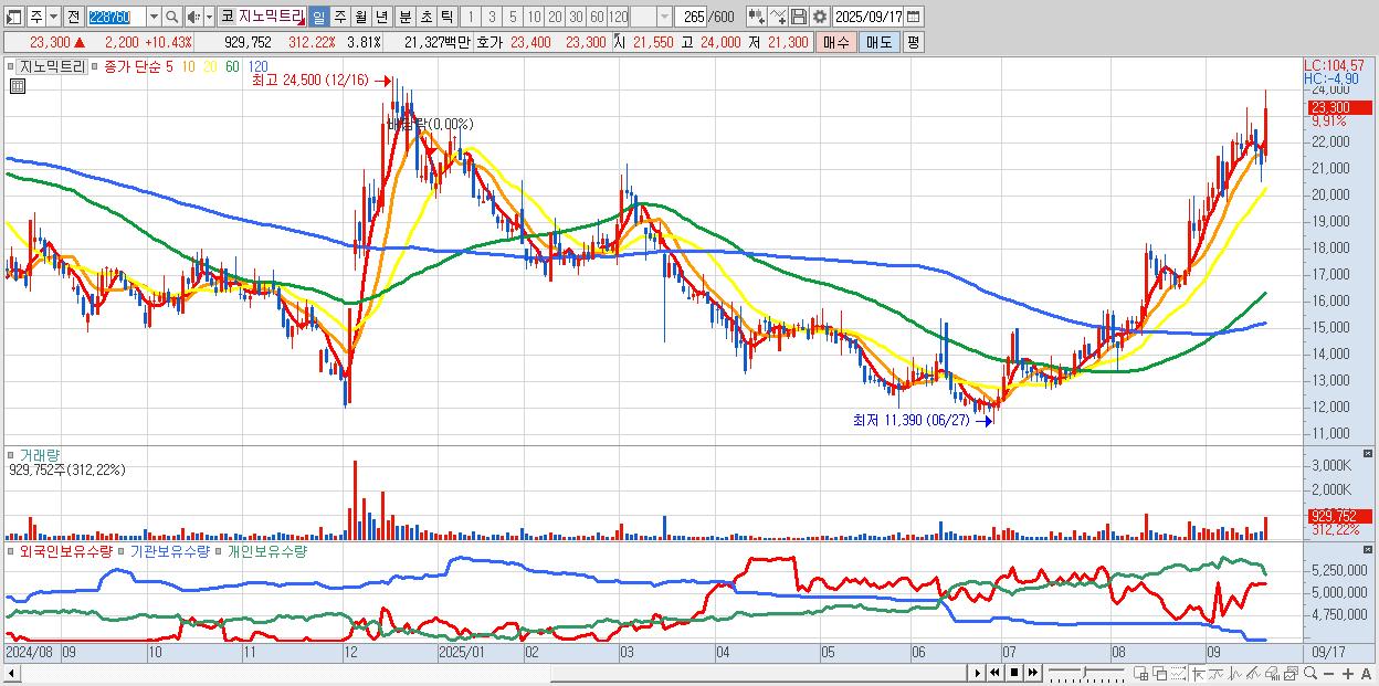 - 지노믹트리 (23,350원 ▲ 10.66% , 시총: 5,692억, 거래량: 482,907, 거래대금:111억)