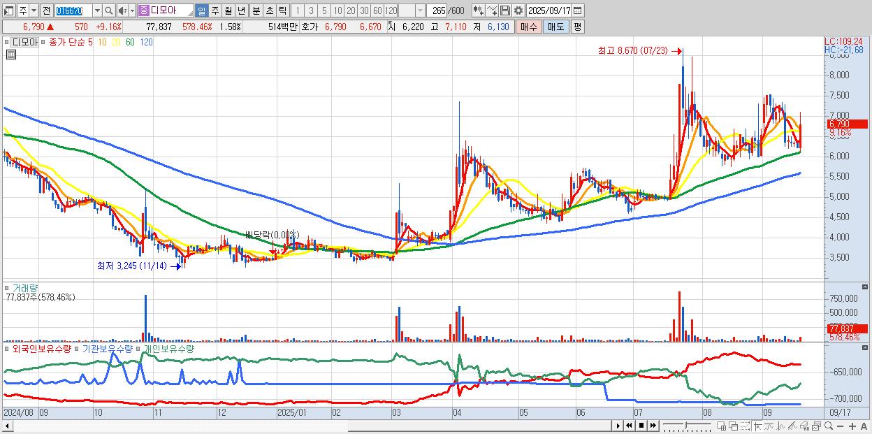 - 디모아 (6,790원 ▲ 9.16% , 시총: 336억, 거래량: 77,837, 거래대금:5억)