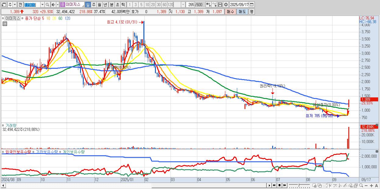 - 이미지스 (1,389원 ▲ 29.93% , 시총: 328억, 거래량: 32,494,422, 거래대금:420억)