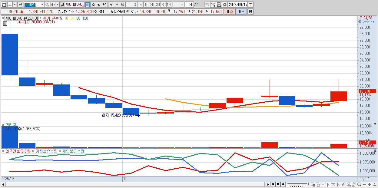- 제이피아이헬스케어 (19,210원 ▲ 11.17% , 시총: 981억, 거래량: 2,747,132, 거래대금:534억)