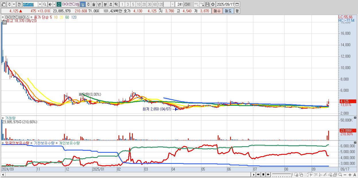 - 아이언디바이스 (4,125원 ▲ 13.01% , 시총: 576억, 거래량: 23,885,979, 거래대금:1,014억)