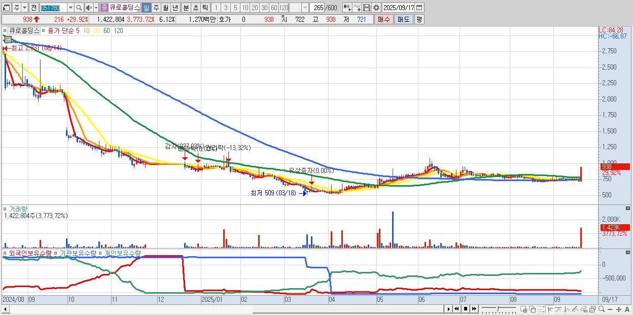 - 큐로홀딩스 (938원 ▲ 29.92% , 시총: 218억, 거래량: 1,422,804, 거래대금:13억)