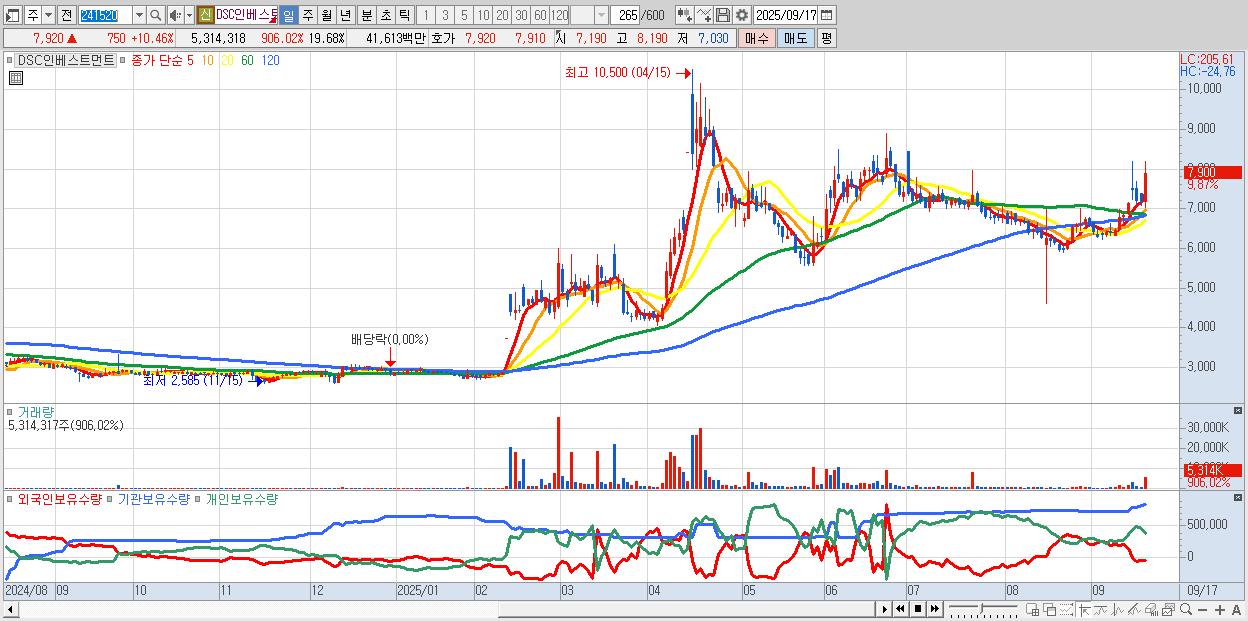 - DSC인베스트먼트 (7,830원 ▲ 9.21% , 시총: 2,114억, 거래량: 1,132,416, 거래대금:86억)