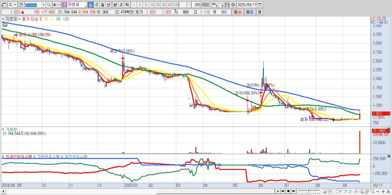 - 지엔코 (1,023원 ▲ 17.86% , 시총: 243억, 거래량: 21,744,544, 거래대금:225억)