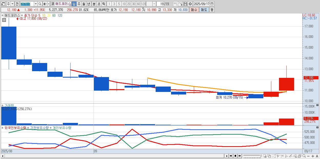 - 애드포러스 (12,180원 ▲ 11.95% , 시총: 627억, 거래량: 5,227,370, 거래대금:659억)