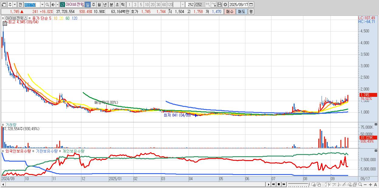 - 아이비젼웍스 (1,745원 ▲ 16.02% , 시총: 593억, 거래량: 37,728,554, 거래대금:632억)
