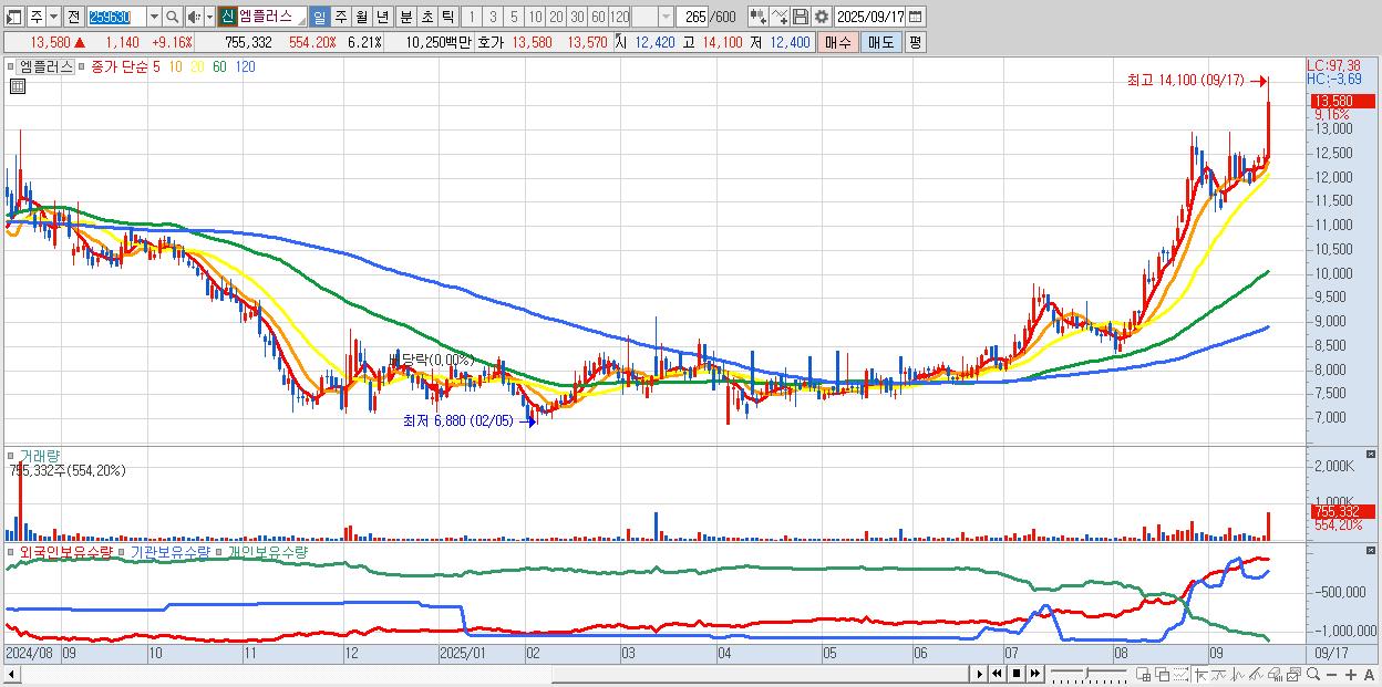 - 엠플러스 (13,580원 ▲ 9.16% , 시총: 1,651억, 거래량: 755,332, 거래대금:102억)