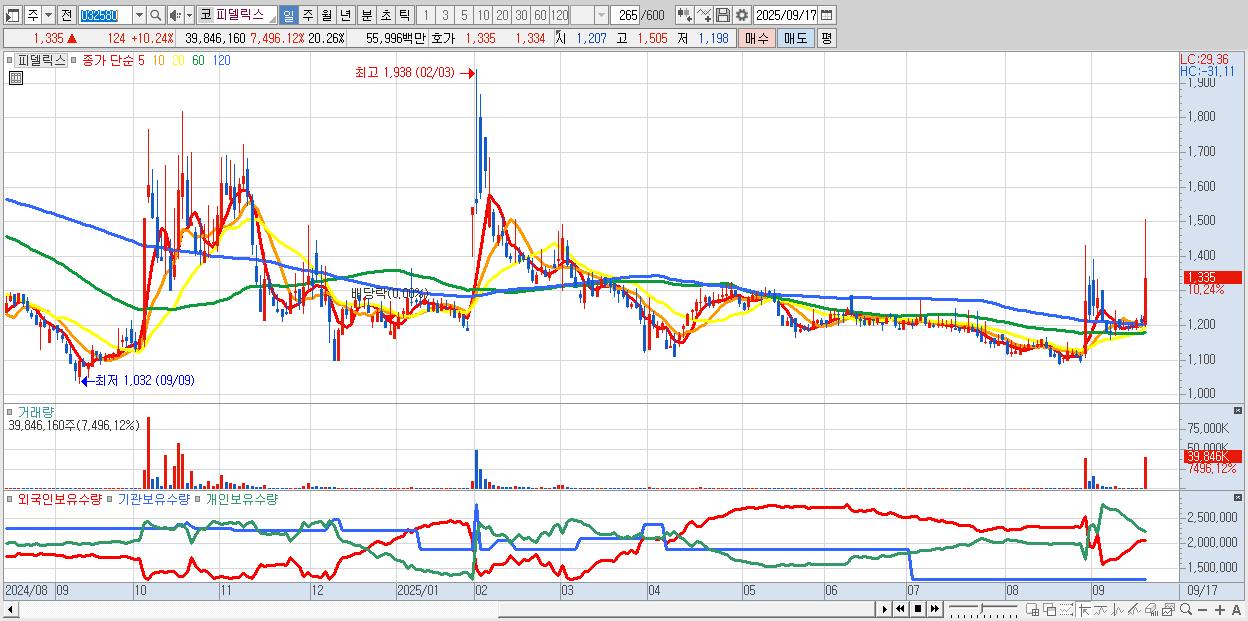 - 피델릭스 (1,335원 ▲ 10.24% , 시총: 442억, 거래량: 39,846,160, 거래대금:560억)