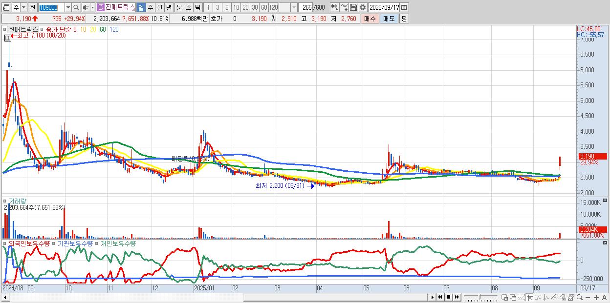 - 진매트릭스 (3,190원 ▲ 29.94% , 시총: 651억, 거래량: 2,203,664, 거래대금:70억)