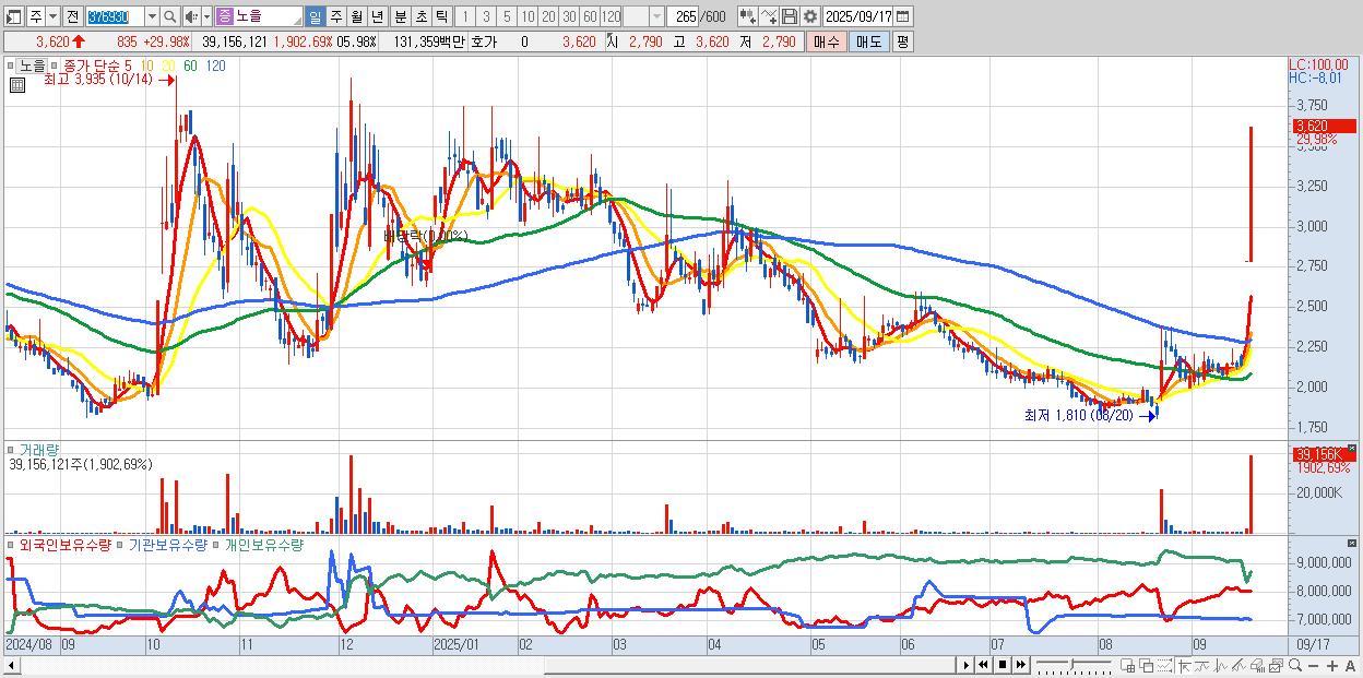 - 노을 (3,620원 ▲ 29.98% , 시총: 1,337억, 거래량: 39,156,121, 거래대금:1,314억)