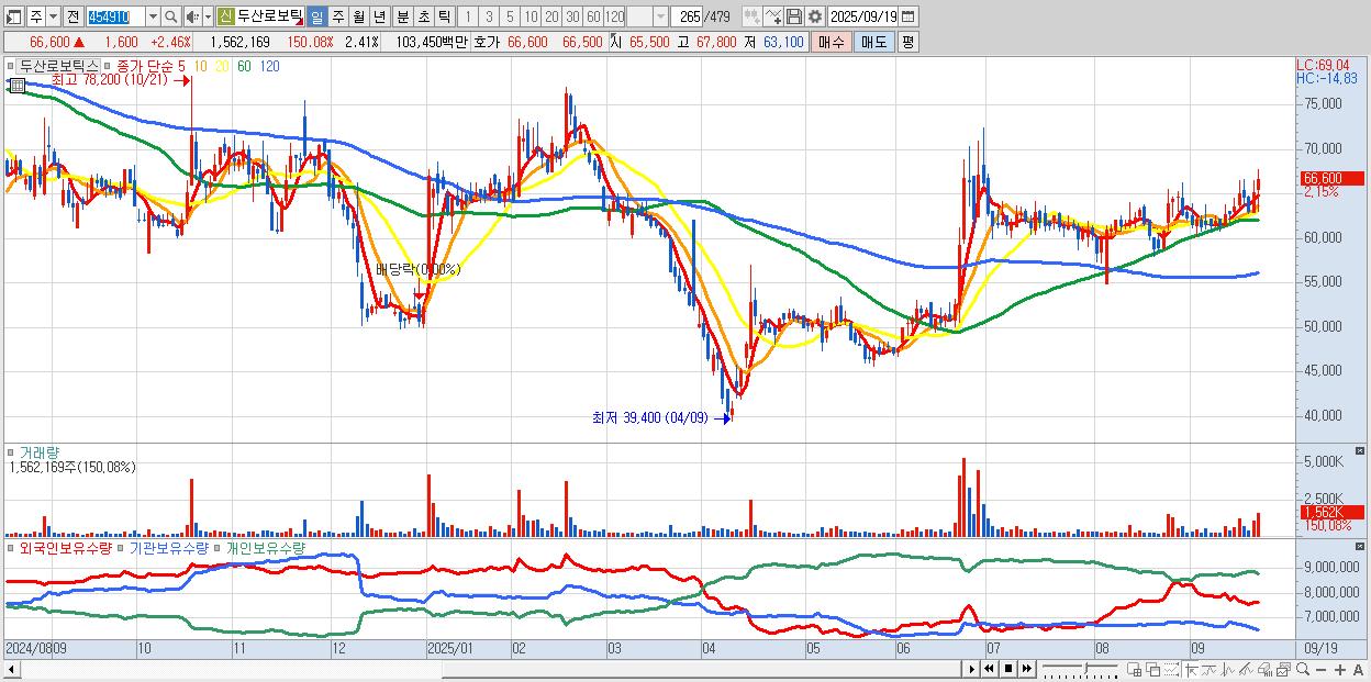 - 두산로보틱스 (66,400원 ▲ 2.15% , 시총: 43,040억, 외국인 순매수 거래금:89억)