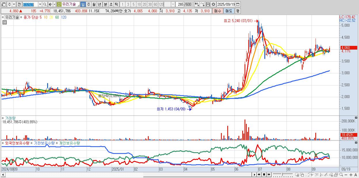 - 우리기술 (4,060원 ▲ 4.77% , 시총: 6,721억, 외국인 순매수 거래금:124억)
