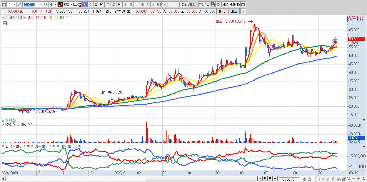- 한화시스템 (59,600원 ▲ 0.85% , 시총: 112,596억, 외국인 순매수 거래금:171억)