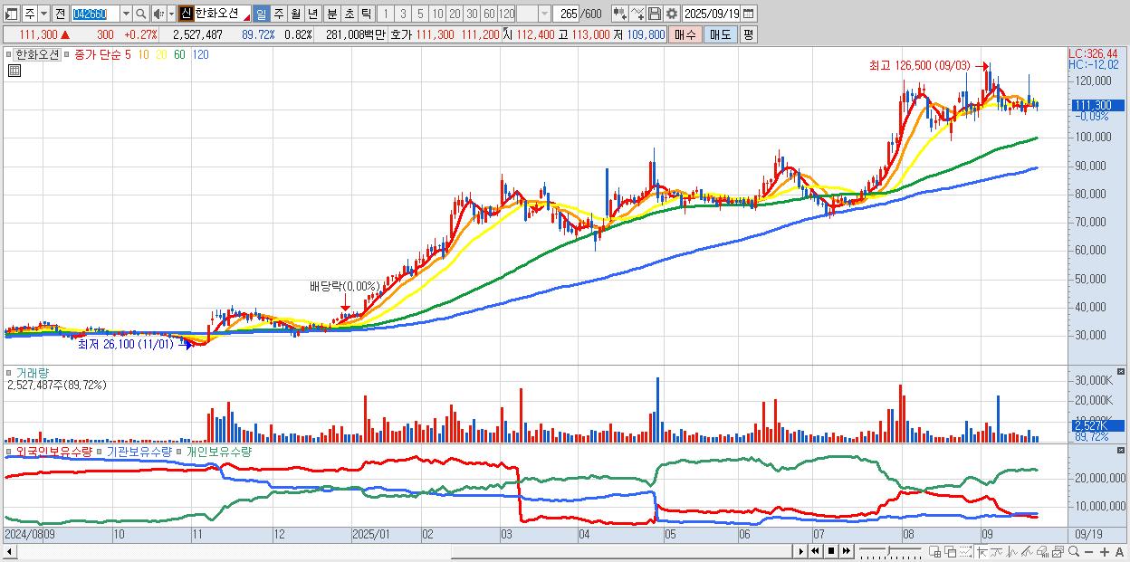 - 한화오션 (111,700원 ▲ 0.63% , 시총: 342,264억, 외국인 순매수 거래금:171억)