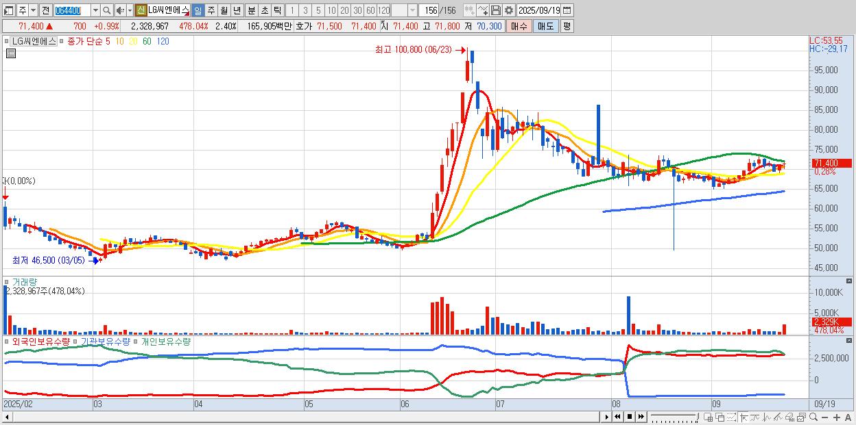 - LG씨엔에스 (71,300원 ▲ 0.85% , 시총: 69,080억, 외국인 순매수 거래금:268억)