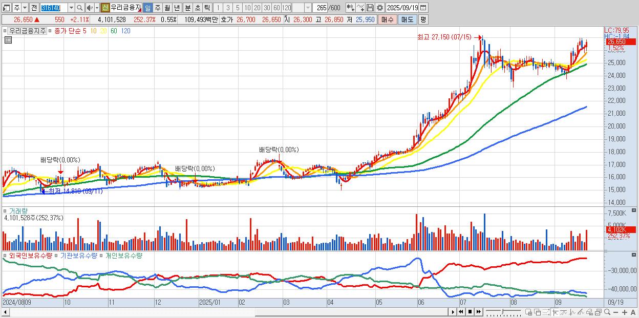 - 우리금융지주 (26,850원 ▲ 2.87% , 시총: 199,386억, 외국인 순매수 거래금:167억)