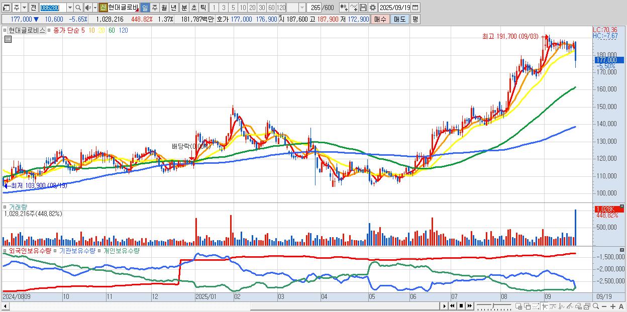 - 현대글로비스 (178,000원 ▼ -5.12% , 시총: 133,500억, 외국인 순매수 거래금:157억)