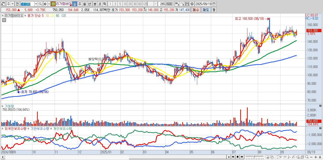 - 리가켐바이오 (153,400원 ▲ 3.86% , 시총: 56,160억, 외국인 순매수 거래금:184억)