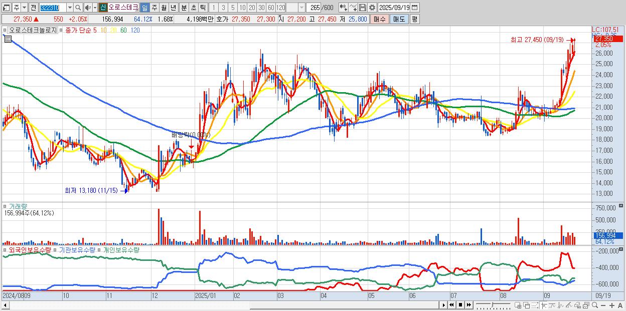 - 오로스테크놀로지 (27,350원 ▲ 2.05% , 시총: 2,562억, 거래량: 156,994, 거래대금:42억, KOSDAQ)