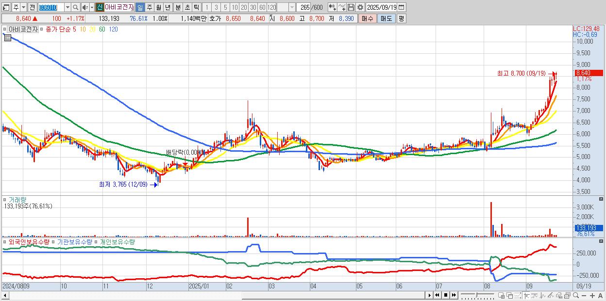 - 아비코전자 (8,640원 ▲ 1.17% , 시총: 1,149억, 거래량: 133,193, 거래대금:11억, KOSDAQ)