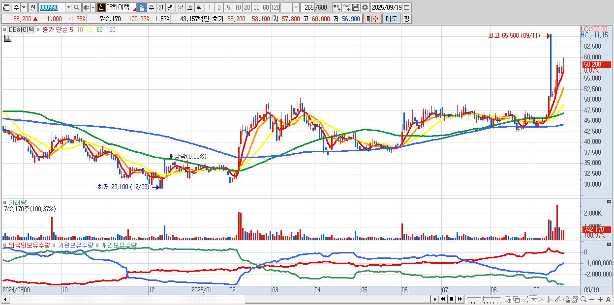 - DB하이텍 (58,400원 ▲ 2.1% , 시총: 25,929억, 거래량: 429,332, 거래대금:249억, KOSPI)
