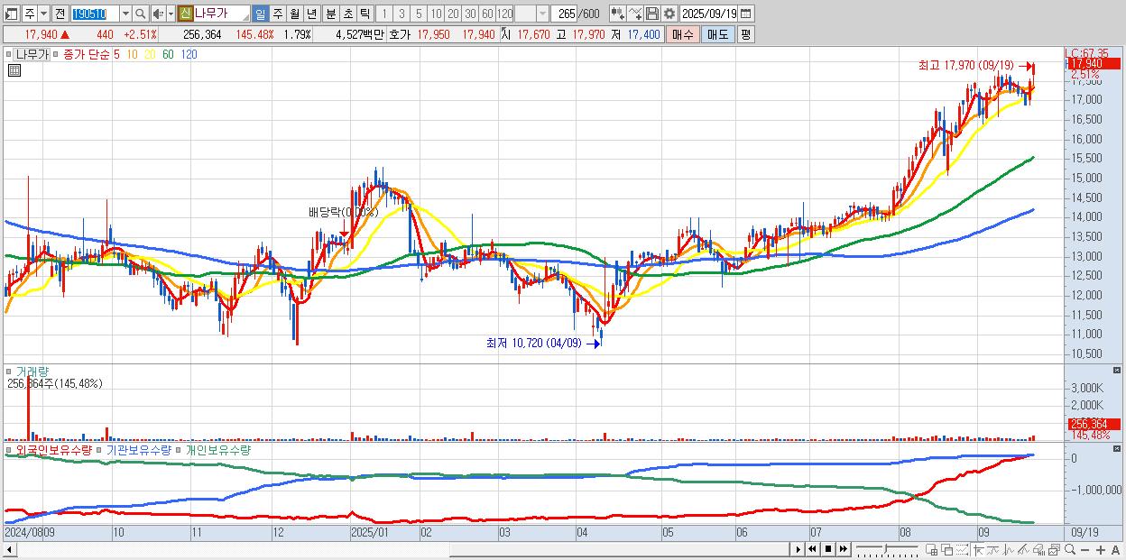 - 나무가 (17,940원 ▲ 2.51% , 시총: 2,572억, 거래량: 256,364, 거래대금:45억, KOSDAQ)