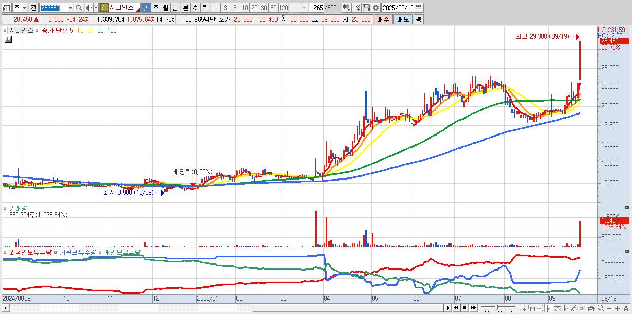- 지니언스 (26,100원 ▲ 13.97% , 시총: 2,370억, 거래량: 355,497, 거래대금:92억, KOSDAQ)