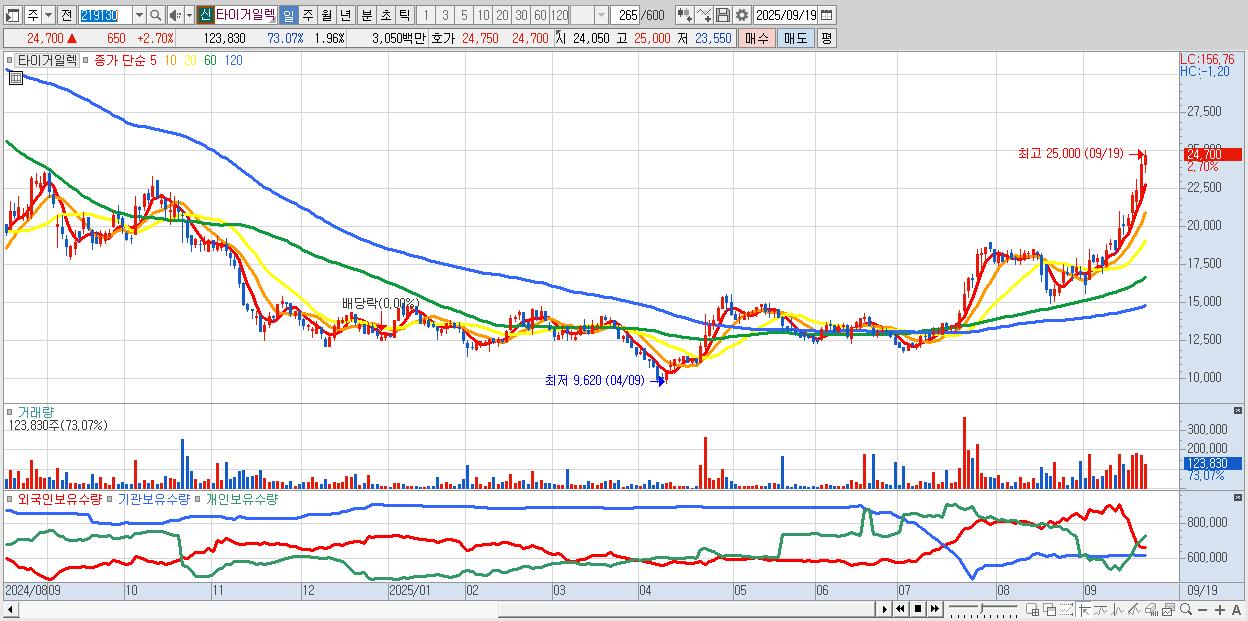 - 타이거일렉 (24,700원 ▲ 2.7% , 시총: 1,560억, 거래량: 123,830, 거래대금:31억, KOSDAQ)