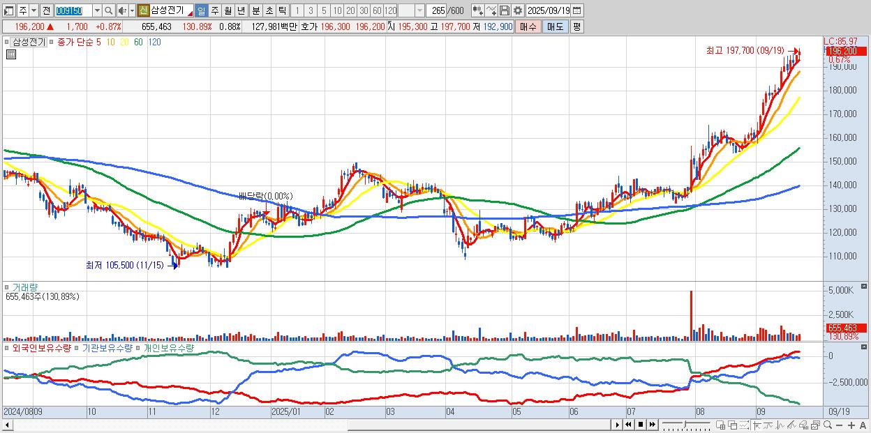 - 삼성전기 (197,700원 ▲ 1.65% , 시총: 147,669억, 거래량: 532,083, 거래대금:1,040억, KOSPI)