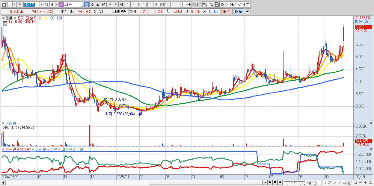 - 레몬 (6,200원 ▲ 14.6% , 시총: 1,390억, 거래량: 844,185, 거래대금:51억, KOSDAQ)