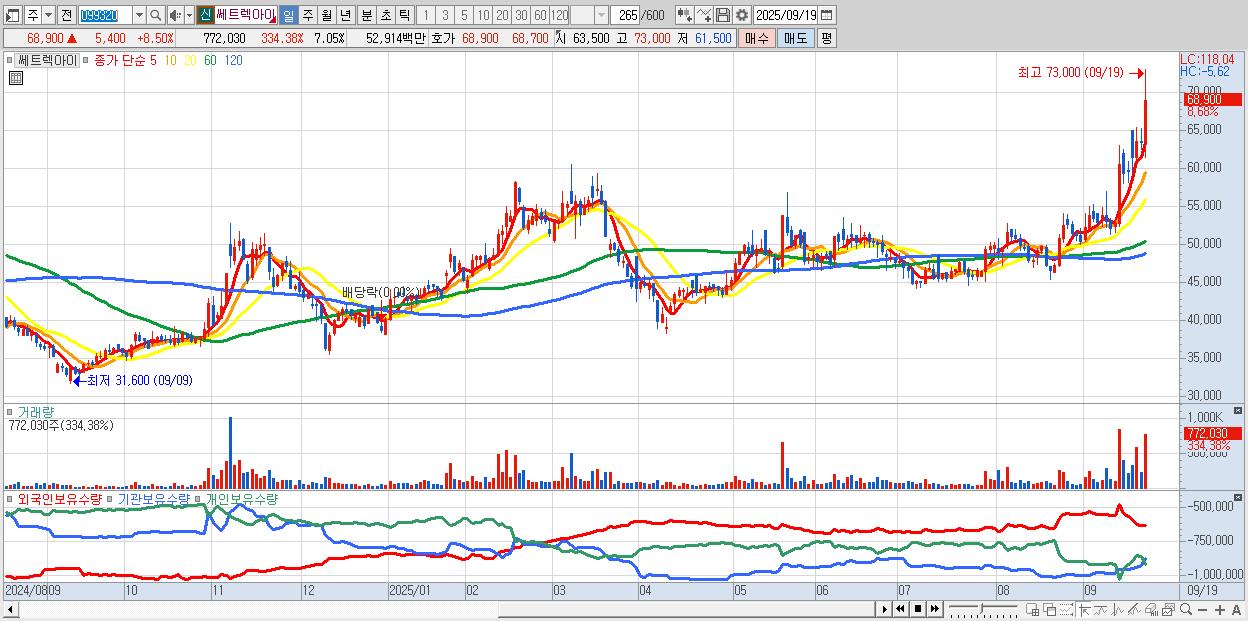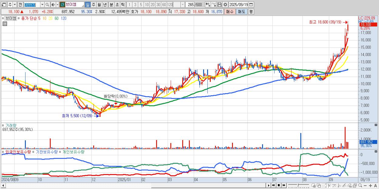 - 브이엠 (18,100원 ▲ 6.28% , 시총: 4,358억, 거래량: 697,952, 거래대금:125억, KOSDAQ)