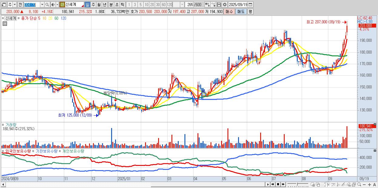- 신세계 (205,500원 ▲ 5.44% , 시총: 19,821억, 거래량: 151,069, 거래대금:307억, KOSPI)