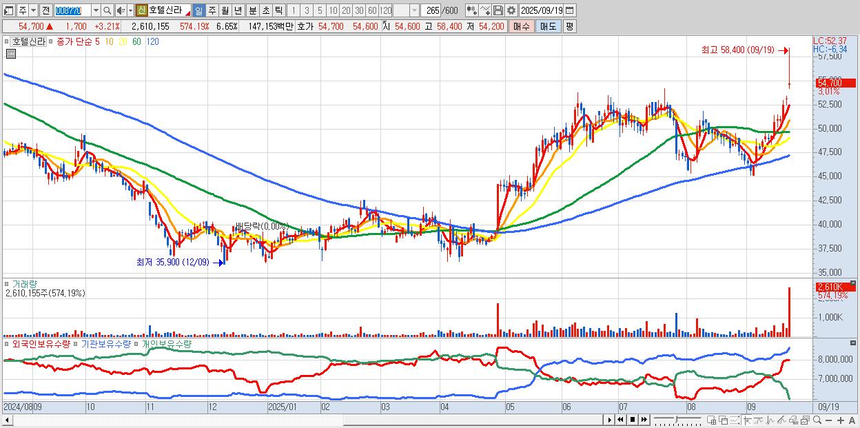- 호텔신라 (54,700원 ▲ 3.21% , 시총: 21,469억, 거래량: 1,815,713, 거래대금:1,023억, KOSPI)