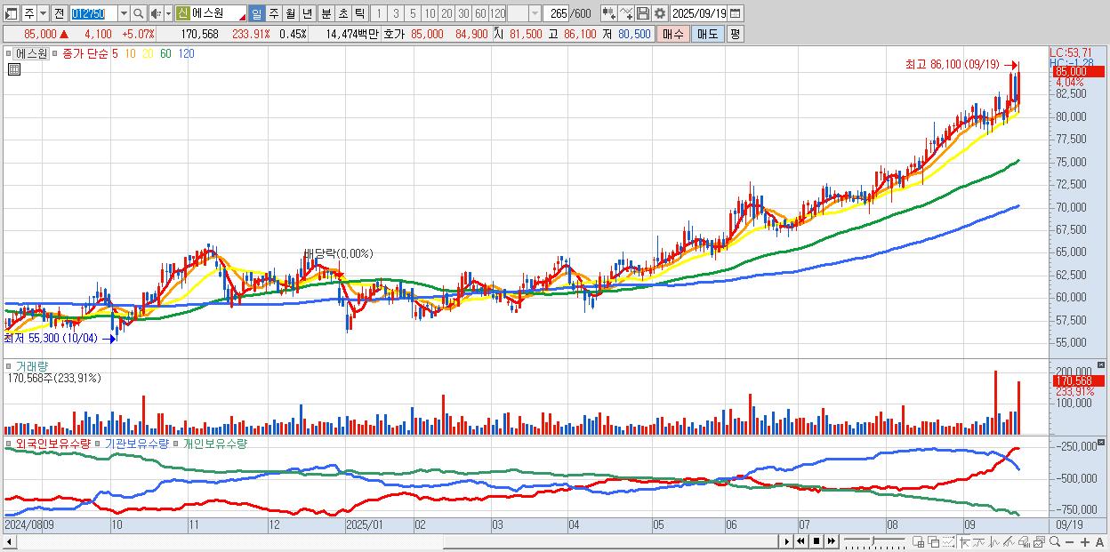 - 에스원 (86,100원 ▲ 6.43% , 시총: 32,717억, 거래량: 163,654, 거래대금:139억, KOSPI)