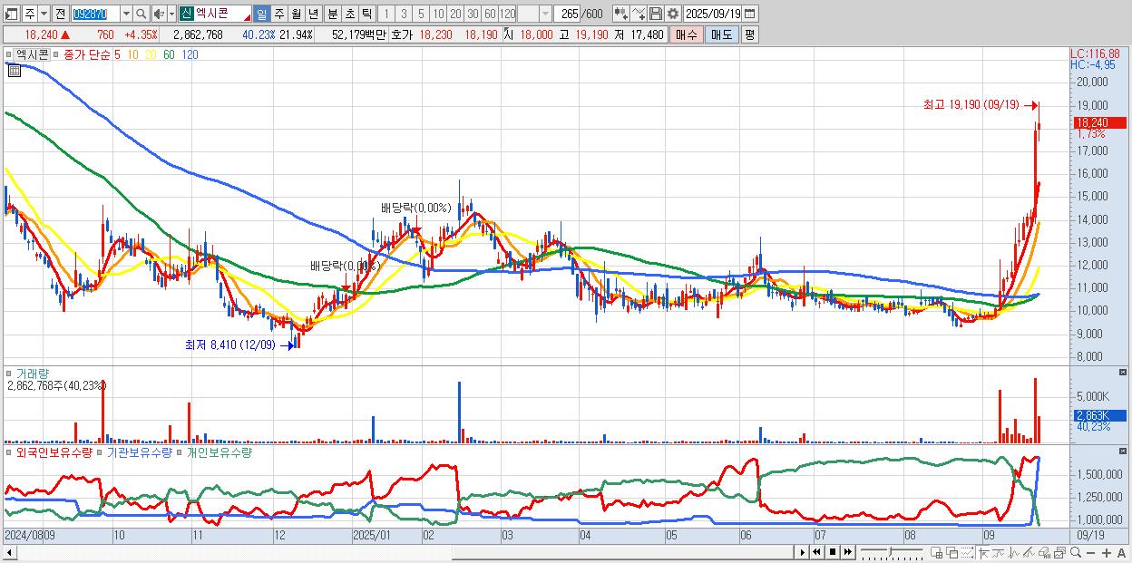 - 엑시콘 (18,300원 ▲ 4.69% , 시총: 2,388억, 거래량: 955,709, 거래대금:173억, KOSDAQ)