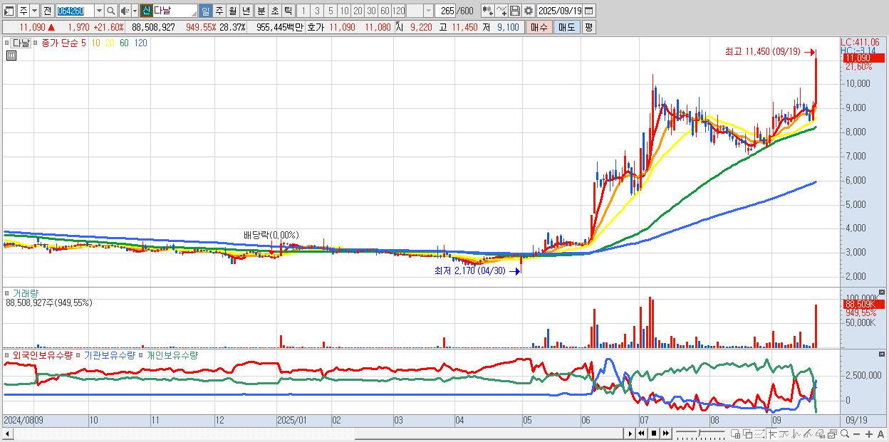- 다날 (11,090원 ▲ 21.6% , 시총: 7,646억, 거래량: 88,508,927, 거래대금:9,554억, KOSDAQ)
