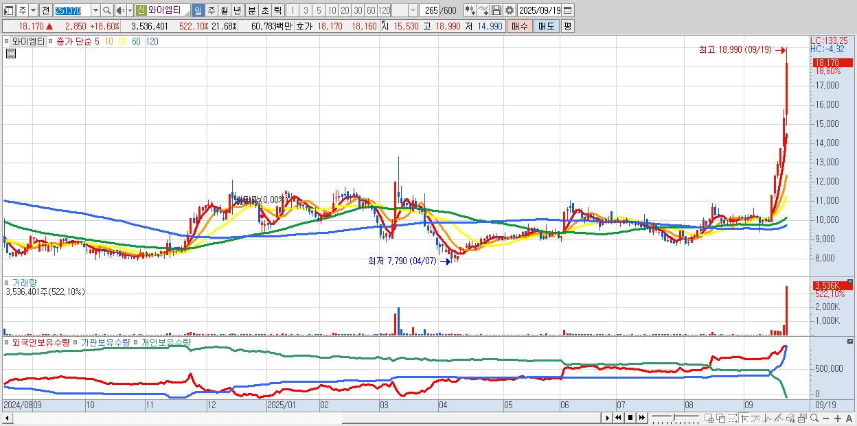 - 와이엠티 (18,170원 ▲ 18.6% , 시총: 2,964억, 거래량: 3,536,401, 거래대금:608억, KOSDAQ)