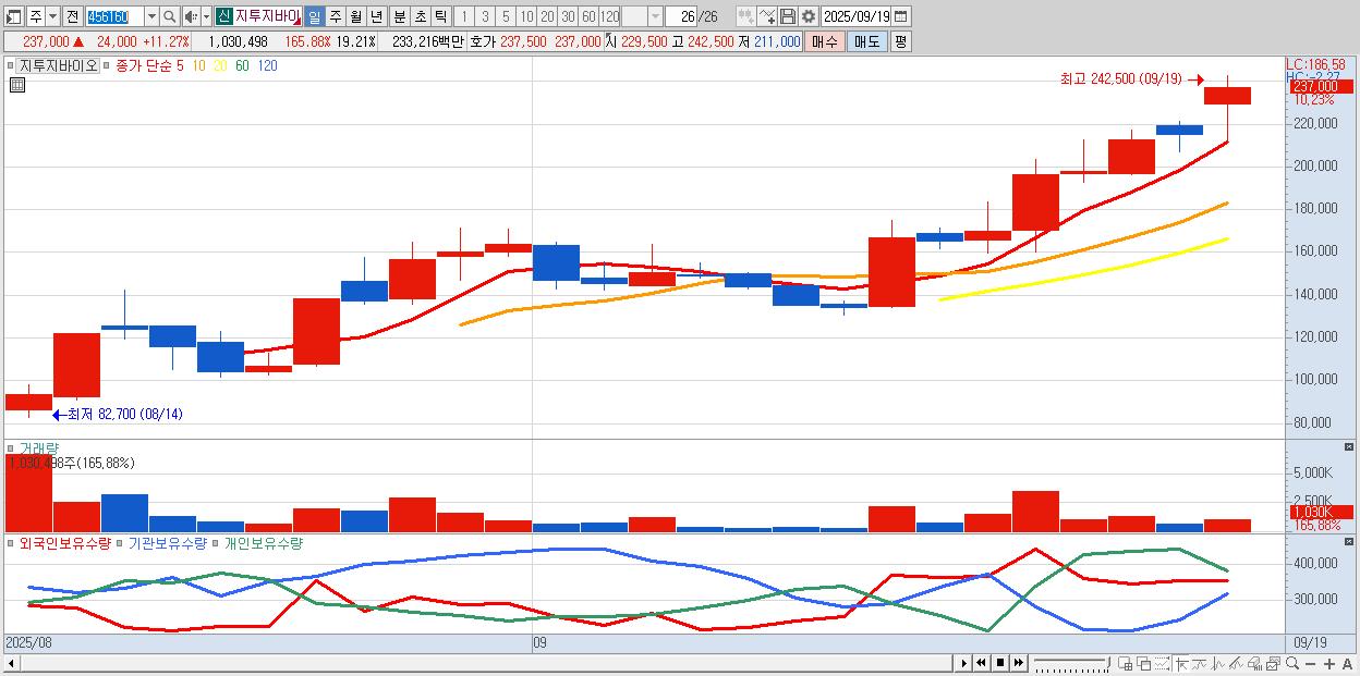 - 지투지바이오 (234,000원 ▲ 9.86% , 시총: 12,556억, 거래량: 516,299, 거래대금:1,165억, KOSDAQ)