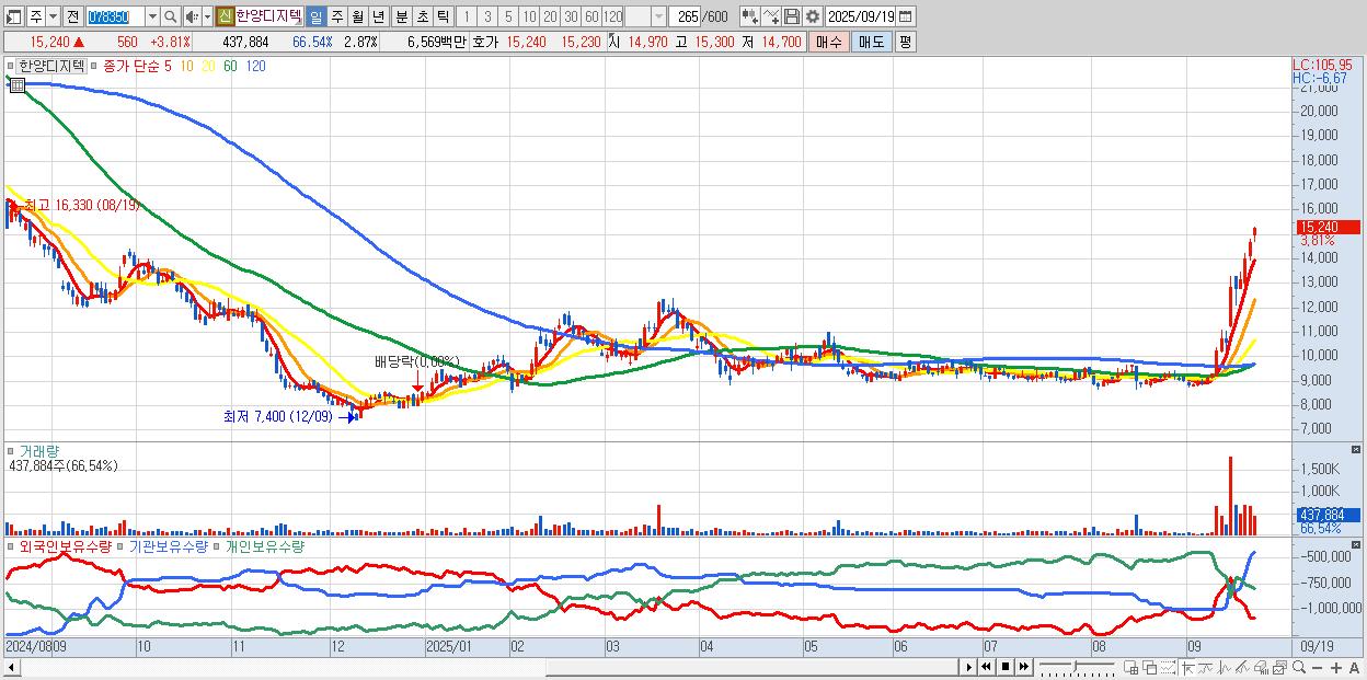- 한양디지텍 (15,240원 ▲ 3.81% , 시총: 2,323억, 거래량: 437,884, 거래대금:66억, KOSDAQ)