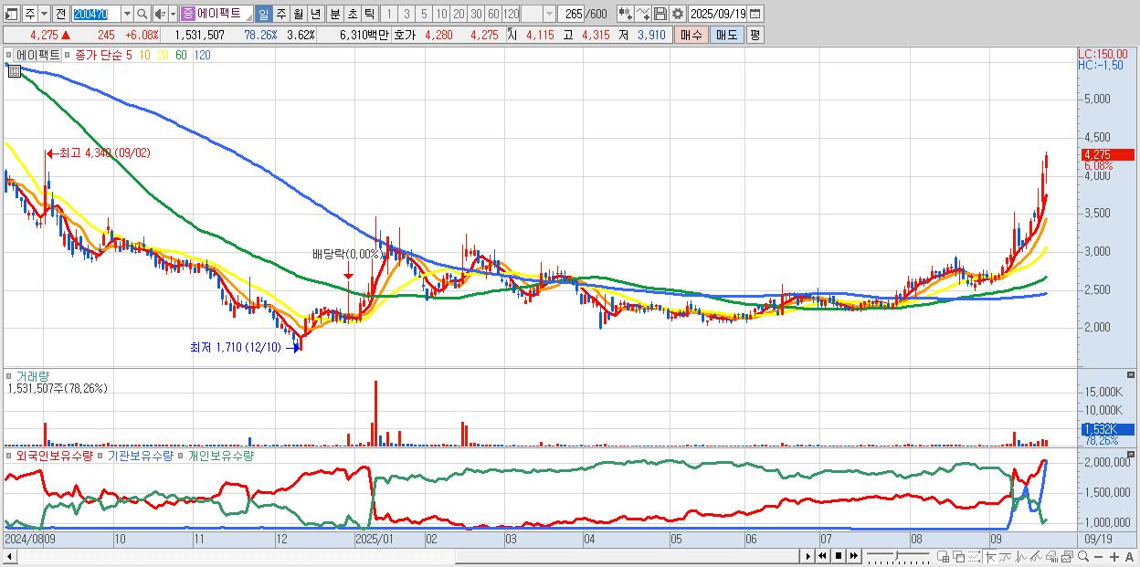 - 에이팩트 (4,275원 ▲ 6.08% , 시총: 1,811억, 거래량: 1,531,507, 거래대금:63억, KOSDAQ)