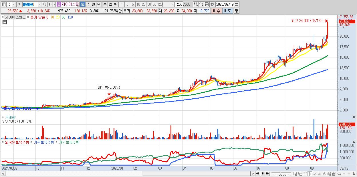 - 제이에스링크 (23,550원 ▲ 18.34% , 시총: 6,988억, 거래량: 978,480, 거래대금:218억, KOSDAQ)