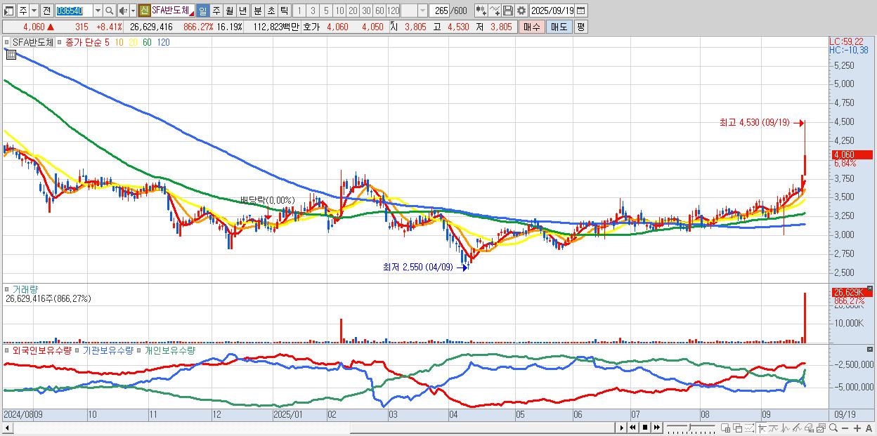 - SFA반도체 (4,085원 ▲ 9.08% , 시총: 6,718억, 거래량: 7,604,134, 거래대금:317억, KOSDAQ)