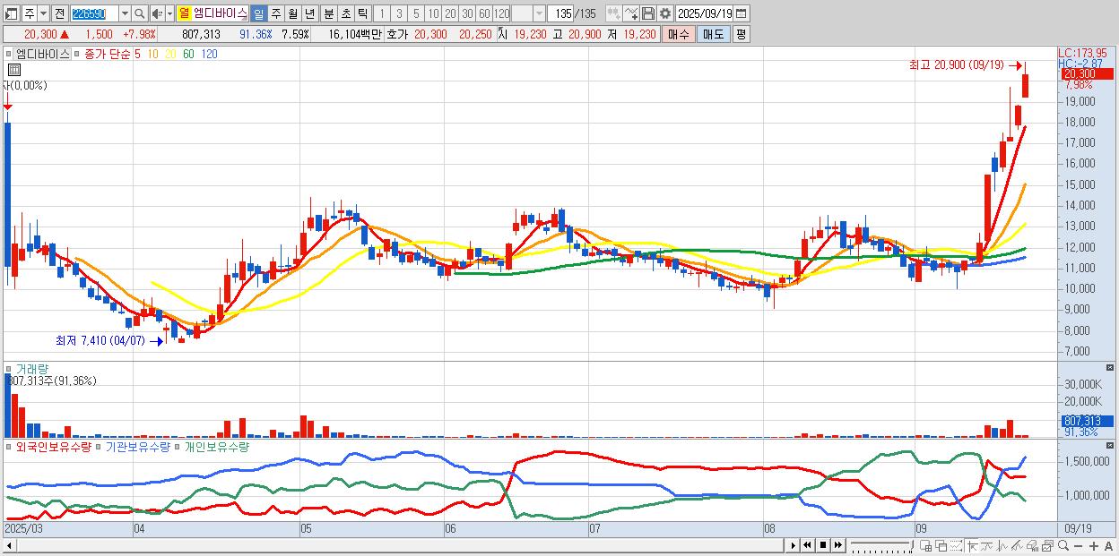 - 엠디바이스 (20,300원 ▲ 7.98% , 시총: 2,158억, 거래량: 807,313, 거래대금:161억, KOSDAQ)